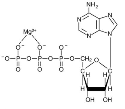 Structure of ATP- In ATP, a chain of three phosphate residues are linked to the 5′-OH group of the nucleoside adenosine (figure-1). These phosphate residues are termed α, β, and γ. The α phosphate is bound to ribose by a phosphoric acid ester bond. The linkages between the three phosphate residues, on the other hand, involve much more unstable phosphoric acid anhydride bonds. The active coenzyme is in fact generally a complex of ATP with an Mg2+ ion, which is coordinatively bound to the β and γ phosphates (Mg2+ ATP4–)- Figure-1.