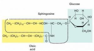 Cerebrosides occur in large amounts in the white matter of the brain and in the myelin sheath of nerves. Structurally, Cerebrosides contain a carbohydrate, which is generally galactose or sometimes glucose, a high molecular weight fatty acid, alcohol, which is sphingosine, or Dihydro sphingosine (See the structure below- figure 1). There is no glycerol, no phosphoric acid, and no nitrogenous base. The type of fatty acid present in them differentiates individual cerebrosides.