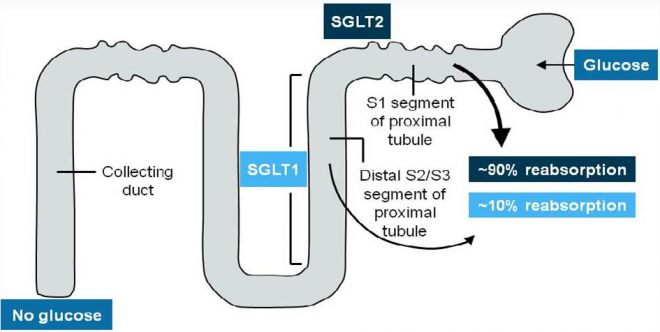 SGLT-2 is a sodium-dependent glucose transporter in the proximal renal tubules. 90 percent of filtered glucose is reabsorbed through SGLT-2, the deficiency of which causes renal glycosuria, as in the present situation. SGLT-2 inhibitors are used in the treatment of Diabetes mellitus. Sodium-glucose co-transporter 2 (SGLT2) inhibitors, also known as gliflozin drugs, are a new class of diabetic medications indicated for the treatment of type 2 diabetes. SGLT2 inhibitors block glucose reabsorption in the kidney, increase glucose excretion, and lower blood glucose levels (figure).