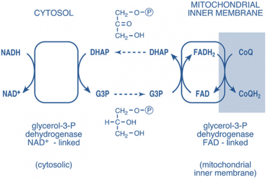1) The glycerol 3-phosphate shuttle (figure-1) functions primarily in skeletal muscle and brain. The shuttle takes advantage of the fact that the enzyme glycerol-3-phosphate dehydrogenase exists in two forms, a cytosolic form that uses NAD+ as a cofactor and a mitochondrial FAD-linked form.