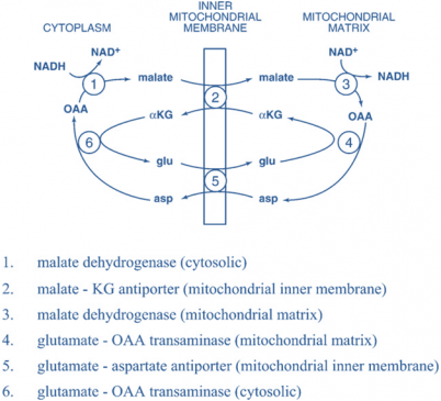 The last step of the shuttle is catalyzed by cytosolic glutamate-oxaloacetate transaminase regenerating cytosolic oxaloacetate from aspartate and cytosolic glutamate from α-ketoglutarate(6) both of which were earlier transported in opposing directions by the malate- α- ketoglutarate antiporter.