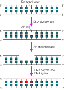BER is initiated by DNA glycosylases, which catalyze the hydrolysis of the N-glycosidic bonds, linking particular types of chemically altered bases to the deoxyribose-phosphate backbone. Thus, DNA damage is excised as free bases, generating sites of base loss called apurinic or apyrimidinic (AP) sites. The AP sites are substrates for AP endonucleases (Figure 2). These enzymes produce incisions in duplex DNA as a result of the hydrolysis of a phosphodiester bond immediately 5′ or 3′ to each AP site. The ribose-phosphate backbone is then removed from the DNA through the action of a specific exonuclease called deoxyribo phosphodiesterase or dRpase. Finally, the DNA polymerase and a ligase catalyze the incorporation of a specific deoxyribonucleotide into the repaired site, enabling correct base pairing (Figure 2).