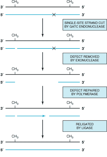 Mismatch repair corrects errors made when DNA is copied. For example, a C could be inserted opposite an A, or the polymerase could slip or stutter and insert two to five extra unpaired bases. Specific proteins scan the newly synthesized DNA using adenine methylation within a GATC sequence as the point of reference (Figure -5). The template strand is methylated, and the newly synthesized strand is not. This difference allows the repair enzymes to identify the strand that contains the errant nucleotide, which requires replacement. If a mismatch or small loop is found, a GATC endonuclease cuts the strand bearing the mutation at a site corresponding to the GATC. An exonuclease then digests this strand from the GATC through the mutation, thus removing the faulty DNA. This can occur from either end if the defect is bracketed by two GATC sites. This defect is then filled in by normal cellular enzymes according to base-pairing rules (Figure 4).