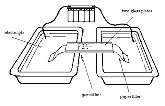 - A long strip of filter paper is moistened with a suitable buffer solution of the desired p Hand the sample is applied transversely across the central part of the strip
