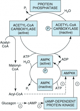 Figure-6- The hormonal regulation is mediated by phosphorylation/dephosphorylation; the enzyme is inactivated by phosphorylation by AMP-activated protein kinase (AMPK), which in turn is phosphorylated and activated by AMP-activated protein kinase kinase (AMPKK). Glucagon (and epinephrine) increase cAMP and thus activate this latter enzyme via cAMP-dependent protein kinase. The kinase kinase enzyme is also believed to be activated by acyl-CoA. Insulin activates acetyl-CoA carboxylase, probably through an “activator” protein and an insulin-stimulated protein kinase.
