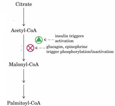 - Feedback Inhibition- The enzyme is inhibited by Malonyl co A and Palmitoyl co A, an example of negative feedback inhibition by a product of a reaction (Figure 4). Thus, if acyl-CoA accumulates because it is not esterified quickly enough or because of increased lipolysis or an influx of free fatty acids into the tissue, it will automatically reduce the synthesis of new fatty acids. Acyl-CoA also inhibits the mitochondrial tricarboxylate transporter, thus preventing activation of the enzyme by egress of citrate from the mitochondria into the cytosol.