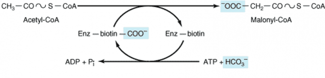 (2) transfer of the carboxyl to acetyl-CoA to form malonyl-CoA (Figure-3)