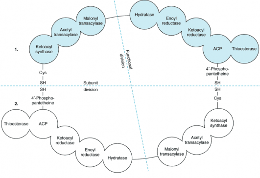 Figure-2- Fatty acid synthase multienzyme complex- The —SH of the 4′-phosphopantetheine of one monomer is in close proximity to the —SH of the cysteine residue of the ketoacyl synthase of the other monomer, suggesting a “head-to-tail” arrangement of the two monomers. Though each monomer contains all the partial activities of the reaction sequence, the actual functional unit consists of one-half of one monomer interacting with the complementary half of the other. Thus, two acyl chains are produced simultaneously.