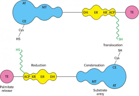 - Domain 3, the palmitate release unit, contains the Thioesterase.