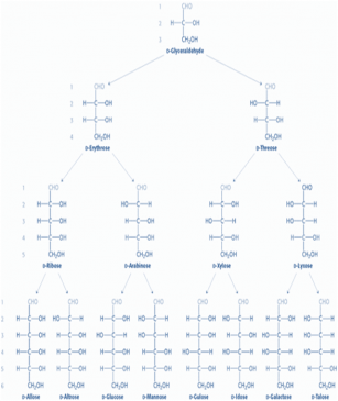 Figure-2- showing the possible isomers of Aldose D sugars containing 3,4,5 and 6 carbon atoms. Each of them will have the L isomer also. Thus Glucose has 8+8 =16 isomers i.e. 8 D isomers and 8 L isomers. The number of possible isomers of any sugar is derived from the formula 2n, where n represents the number of asymmetric carbon atoms. Taking in to account the α and β anomers, there are 32 possible isomers of Glucose.