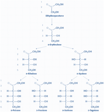 Figure- 3- Showing the possible isomers of ketose sugars (D) with 3, 4, 5 and 6 carbon atoms. The number of asymmetric carbon atoms is less in ketose sugars, thus there are fewer isomers as compared to aldose with the same number of carbon atoms. Dihydroxyacetone has no isomer while fructose has 3 asymmetric carbon atoms, so it has in total 8 isomers, 4 D and 4 L isomers, taking in to account the α and β anomers, there are 16 possible isomers of fructose.