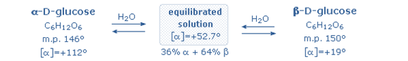 If the initial crystallization takes place at 98 ο and then solubilized, the specific rotation is found to be +19 ο, which also changes to +52.5 ο within a few hours. This change in rotation with time is called Mutarotation. At room temperature, the alpha form predominates and the specific rotation is+112ο, there is transient ring-opening and change in configuration. In the second condition when the crystallization takes place at 98 ο, the Beta form predominates and the specific rotation is+19 ο. Both undergo Mutarotation and at equilibrium, one-third molecules are α type and two-third are β variety to get the specific rotation of +52.5 ο.