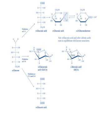 2) Oxidation of Primary Alcoholic acid- Under special conditions when the aldehyde group is protected, and the molecule is oxidized at the primary alcoholic group the product is a Uronic acid. Thus Glucose is oxidized to form Glucuronic acid, Galactose to form Galacturonic acid and Mannose is oxidized to Mannuronic acid. Glucuronic acid is used in the body for conjugation reactions to convert the toxic water-insoluble compounds into a nontoxic water-soluble form, which can be easily excreted in the urine. Glucuronic acid and its epimer Iduronic acid are used for the synthesis of heteropolysaccharides.
