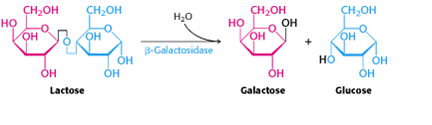 Bacteria such as E. coli usually rely on glucose as their source of carbon and energy. However, when glucose is scarce, E. coli can use lactose as their carbon source even though this disaccharide does not lie on any major metabolic pathways. An essential enzyme in the metabolism of lactose is β-galactosidase, which hydrolyzes lactose into galactose and glucose (Figure 1)