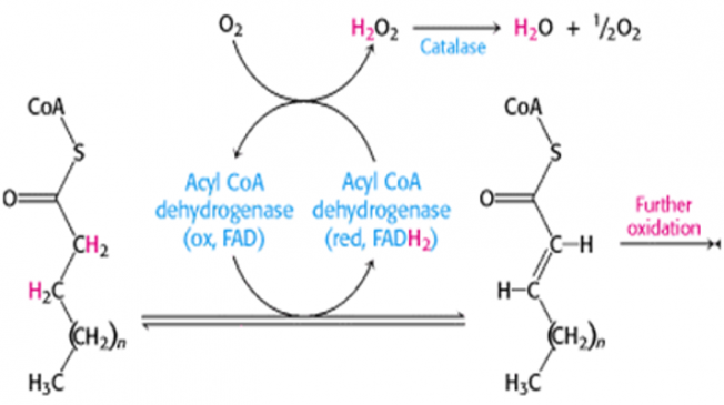 Figure-4- Initiation of Peroxisomal fatty acid degradation: The first dehydration in the degradation of fatty acids in peroxisomes requires a flavoprotein dehydrogenase that transfers electrons to O2 to yield H2O2.