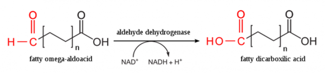 Hydroxy fatty acids can be further oxidized to a dicarboxylic acid via sequential reactions of Alcohol dehydrogenase (figure-2) and aldehyde dehydrogenases (figure-3). The process occurs primarily with medium-chain fatty acids.