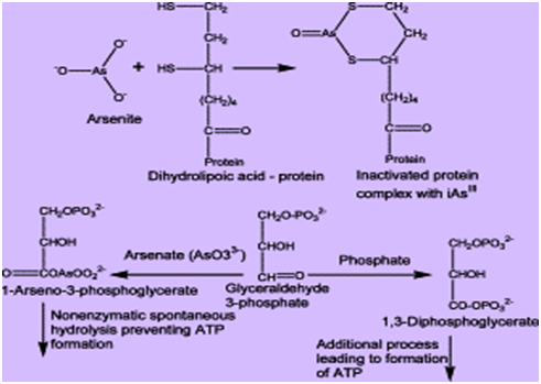 Lipoic acid and all enzymes containing -SH groups are affected by Arsenic poisoning. Arsenat (Pentavalent form of Arsenic)can interfere with glycolysis at the step of Glyceraldeyde-3-P dehydrogenase, thereby causing decreased ATP and NADH production by glycolysis without inhibiting the pathway itself. The poi on does so by competing with inorganic phosphate as a substrate for Glyceraldehyde-3-Phosphate dehydrogenase, forming a complex that spontaneously hydrolyzes to form 3-phosphoglycerate. Thus, bypassing the synthesis and dephosphorylation of 1,3 BPG, the cell is deprived of energy usually obtained from Glycolysis.