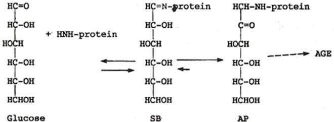 In diabetes mellitus, insulin deficiency promotes hyperglycemia due to non-utilization of glucose. Increased glucose leads to the formation of advanced glycosylation end products (AGEs) via the nonenzymatic glycosylation of intra- and extracellular proteins. Nonenzymatic glycosylation results from the interaction of glucose with amino groups on proteins (Figure 1). AGEs have been shown to cross-link proteins (e.g., collagen, extracellular matrix proteins), accelerate atherosclerosis, promote glomerular dysfunction, reduce nitric oxide synthesis, induce endothelial dysfunction, and alter extracellular matrix composition and structure. The serum level of AGEs correlates with the level of glycemia, and these products accumulate as the glomerular filtration rate declines.