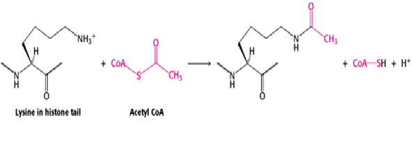 Figure 1- Shows the Acetylation of lysine residues in the amino-terminal ends of Histones. The positive charge is removed after acetylation.