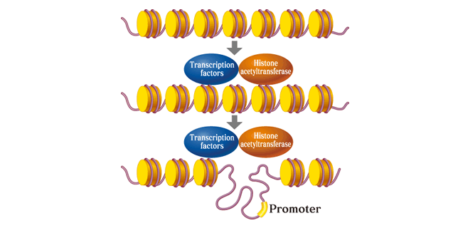 Figure-2- Acetylation of histones leads to disruption of nucleosomal structure and access of transcription machinery for transcription of required genes