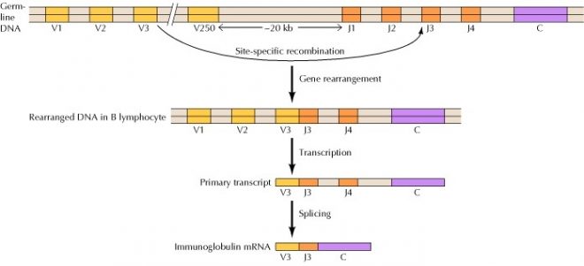 5) Gene Rearrangement- Gene rearrangement is observed during immunoglobulins synthesis. Immunoglobulins are composed of two polypeptides, heavy (about 50 kDa) and light (about 25 kDa) chains. The mRNAs encoding these two protein subunits are encoded by gene sequences that are subjected to extensive DNA sequence-coding changes. These DNA coding changes are needed for generating the required recognition diversity central to appropriate immune function.