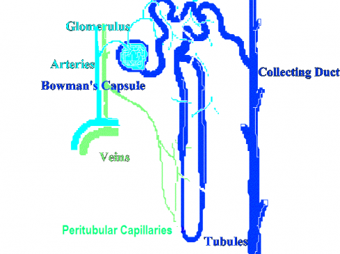 Of the 625 ml/min of plasma that goes to the glomerulus, 125 ml/min is filtered into Bowman’s capsule forming the filtrate (The rate of filtration is known as the Glomerular filtration rate- GFR). The remaining 500 ml/min enters into the peritubular capillaries. Of the 125 ml/min filtered, almost all of the water in this fluid is reabsorbed back into the blood. The composition of the filtrate in Bowman’s capsule is identical to the composition of the plasma except that the filtrate has no or very little amount of proteins.