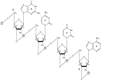 Figure 1- Showing an RNA fragment, the ribonucleotides are linked together by 3′-5′ phosphodiester linkages. Ribose is the principal sugar in RNA
