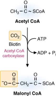 - The synthesis of malonyl-CoA is catalyzed by acetyl-CoA carboxylase, which contains a biotin prosthetic group.