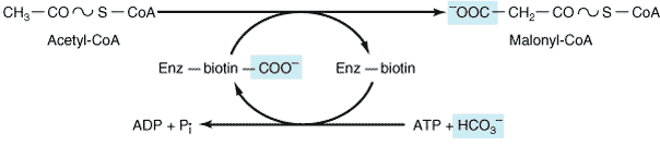 - As with these other enzymes, a carboxy biotin intermediate is formed at the expense of the hydrolysis of a molecule of ATP. The activated CO2 group in this intermediate is then transferred to acetyl-CoA to form malonyl-CoA Figure 2).