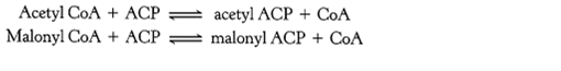 - Initially, a priming molecule of acetyl-CoA combines with a cysteine —SH group catalyzed by acetyl transacylase (Figure 3). Malonyl-CoA combines with the adjacent —SH on the 4′-phosphopantetheine of ACP of the other monomer, catalyzed by malonyl transacylase (reaction 1), to form acetyl (acyl)-malonyl enzyme.Fatty acids with an odd number of carbon atoms are synthesized, starting with propionyl ACP, which is formed from propionyl CoA by acetyl transacylase.