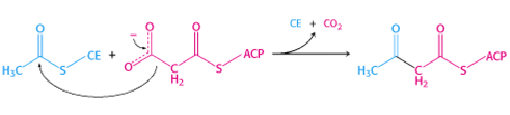 a) Condensation- The acetyl group attacks the methylene group of the malonyl residue, catalyzed by 3-ketoacyl synthase, forming a 3-ketoacyl enzyme (acetoacetyl enzyme) (reaction 2), freeing the cysteine-SH group (Figure 4).