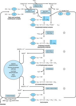 - Five more rounds of condensation and reduction produce a palmitoyl (C16) chain on the condensing enzyme, which is hydrolyzed to palmitate by the thioesterase on domain 3 of the opposite chain.