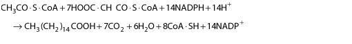 The equation for the overall synthesis of palmitate from acetyl-CoA and malonyl-CoA is as follows: