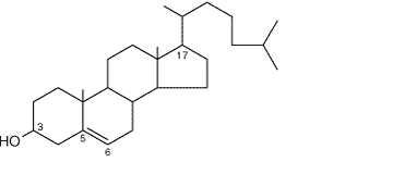 Cholesterol is the major sterol in the animal tissues. The structure of cholesterol consists of four fused rings (the rings in steroids are denoted by the letters A, B, C, and D), with the carbons numbered in the sequence, and an eight numbered, and branched hydrocarbon chain attached to the D ring. Cholesterol contains two angular methyl groups: the C-19 methyl group is attached to C-10, and the C-18 methyl group is attached to C-13. The C-18 and C-19 methyl groups of cholesterol lie above the plane containing the four rings. A double is there between C5 and C6.
