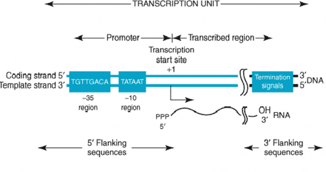 Figure-3-Bacterial promoters share two regions of the highly conserved nucleotide sequences. These regions are located 35 and 10 bp upstream (in the 5′ direction of the coding strand) from the start site of transcription, which is indicated as +1. By convention, all nucleotides upstream of the transcription initiation site (at +1) are numbered in a negative sense and are referred to as 5′-flanking sequences. Also by convention, the DNA regulatory sequence elements (TATA box, etc) are described in the 5′ to 3′ direction and as being on the coding strand. These elements function only in double-stranded DNA.