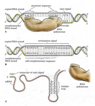 - This process requires the presence of intrachain self-complementary sequences in the newly formed primary transcript so that it can acquire a stable hairpin turn that slows down the progress of the RNA polymerase and causes it to pause temporarily.