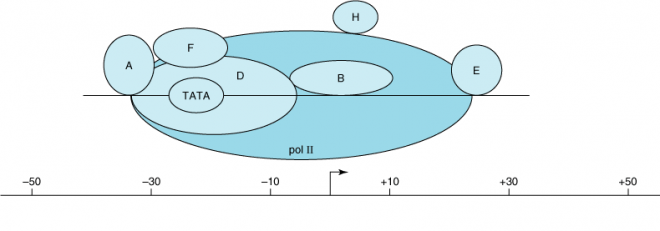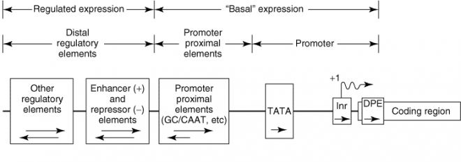 Figure-3- shows that a gene can be divided into its coding and regulatory regions, as defined by the transcription start site (arrow; +1). The coding region contains the DNA sequence that is transcribed into mRNA, which is ultimately translated into protein. The regulatory region consists of two classes of elements. One class is responsible for ensuring basal expression. These elements generally have two components. The proximal component, generally the TATA box or Inr or DPE elements, directs RNA polymerase II to the correct site (fidelity). In TATA-less promoters, an initiator (Inr) element that spans the initiation site (+1) may direct the polymerase to this site. Another component, the upstream elements, specifies the frequency of initiation. Among the best-studied of these is the CAAT box, but several other elements may be used in various genres. The distal regulatory elements consist of enhancers and repressors and other regulatory regions. Enhancers and repressors enhance or repress expression and mediate the response to various signals, including hormones, heat shock, heavy metals, and chemicals.